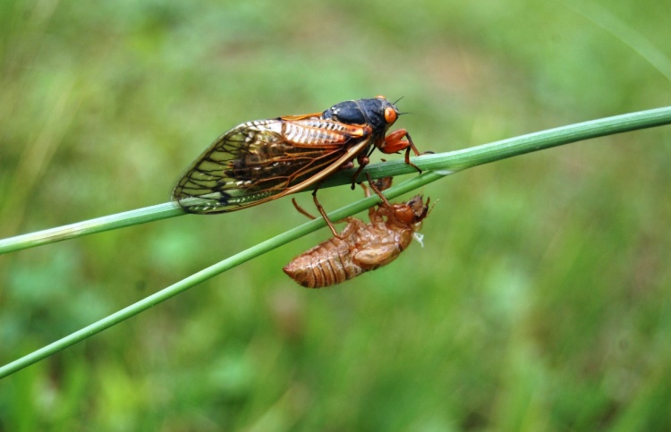 This morning I had my first sighting of the Magicicada. I was putting my son on the bus when I noticed a red-eyed insect hobbling on a dandelion. The cicada, newly emerged with fresh wings, stumbled along the grass and flowers. Leaning down I noticed another and another. The ground was crawling with them.